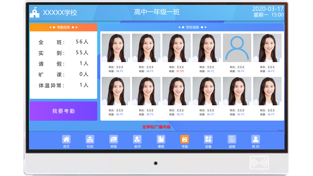 實到、請假、曠課等人數,使教師能更好地把握學生考勤情況,人臉識別率可達到99.9%,